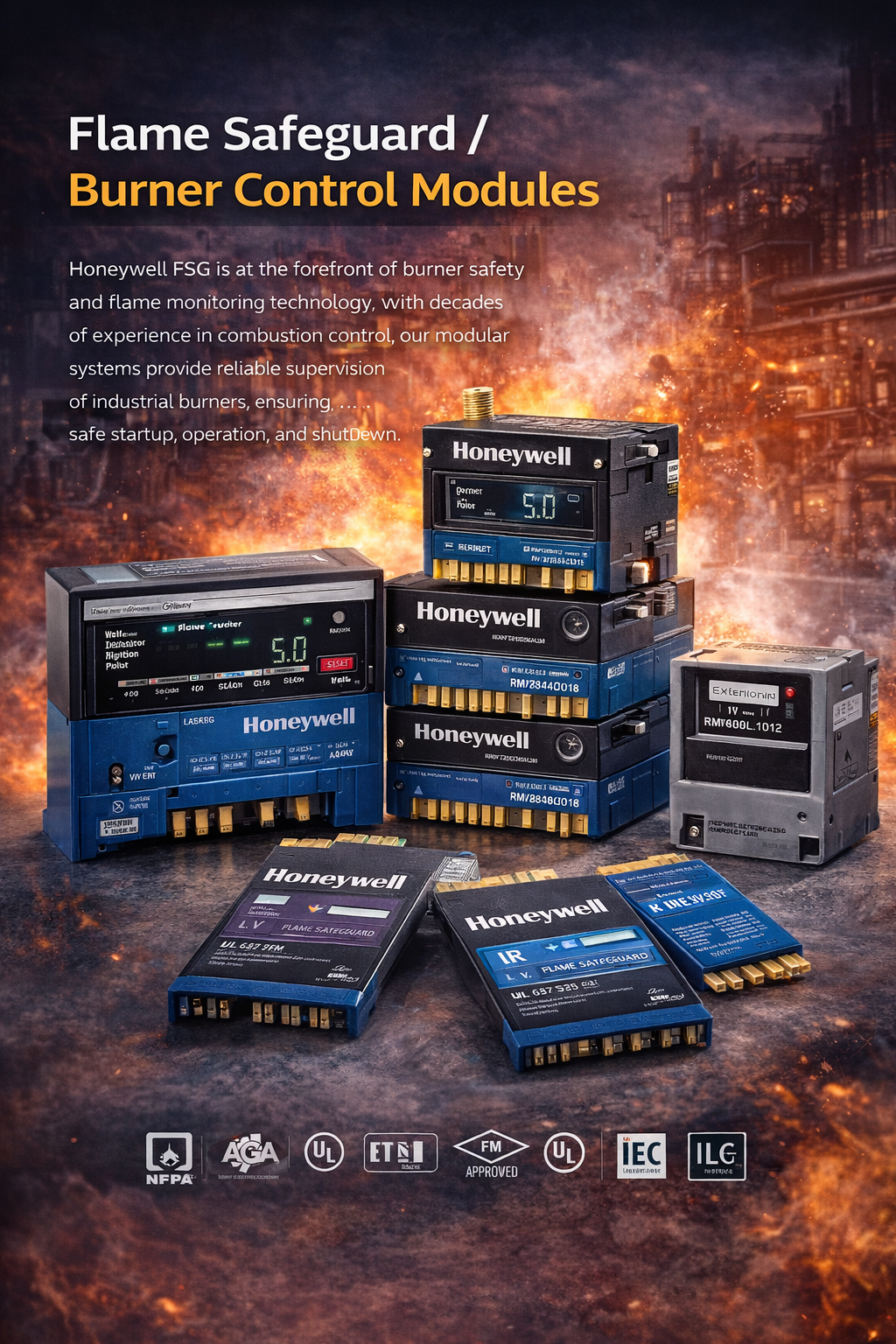 Honeywell Flame Safeguard Group (FSG) is at the forefront of burner safety and flame monitoring technology. With decades of experience in combustion control, FSG offers a comprehensive suite of high-reliability components — from microprocessor-based burner controllers to advanced electro-optical flame detectors. These products ensure precise and responsive detection of flame conditions, enabling safe startup, operation, and shutdown of industrial and commercial combustion systems.